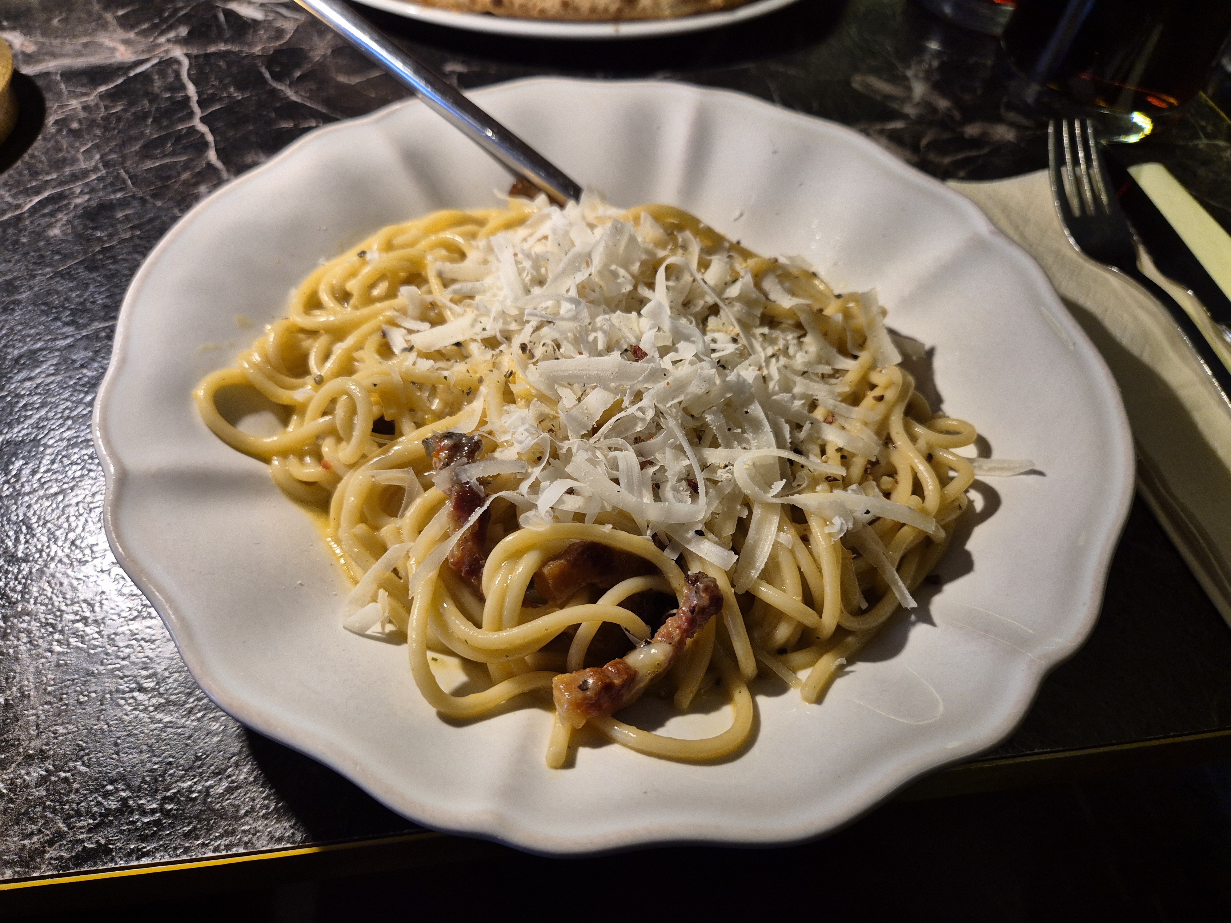 한국에서 많이 먹는 까르보나라는 크림과 우유가 많이 들어가는데 전통방식은 계란노른자를 많이 활용한다 하였다. 확실히 우리나라 까르보나라와 맛이 다르다! 비리지 않고 꾸덕하며 극강의 밸런스를 보여주는 맛이다. 아주 맛있었다.